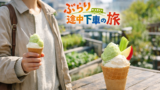 今回の「ぶらり途中下車の旅」は、横尾渉さんが伊豆急行線をぶらりと旅しながら、伊豆の自然、味覚、文化、歴史、体験をたっぷり楽しみました。かき氷の聖地で出会った丸ごと桃のタルト風かき氷をはじめ、バラの香りただよう農園や、家族が手がける個性派陶芸、風情あふれる中国茶カフェなど、五感を通して伊豆の魅力を味わえる旅となりました。