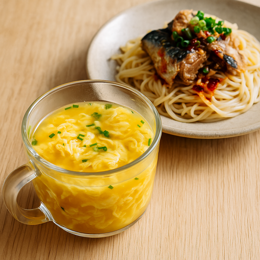 サバのコクとラー油の香ばしい辛味が絶妙にマッチし、食欲をそそります。冷たいそうめんをあえて温かく仕上げることで、秋や冬の朝にもぴったりの“和風スタミナそうめん”です。