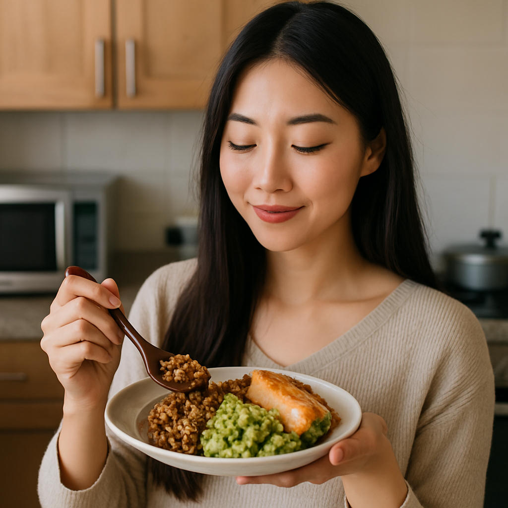 夜は、さば缶+納豆+ブロッコリースプラウト+亜麻仁油。さば缶に含まれるオメガ3系脂肪酸(DHA・EPA)が腸の炎症を抑え、納豆の納豆菌が善玉菌を増やします。ブロッコリースプラウトには抗酸化作用のあるスルフォラファンと豊富な食物繊維が含まれ、亜麻仁油を加えることで良質な脂質がバランスよくプラスされます。体の内側から整い、寝ている間に腸が活発に働く理想的な夜ごはんです。