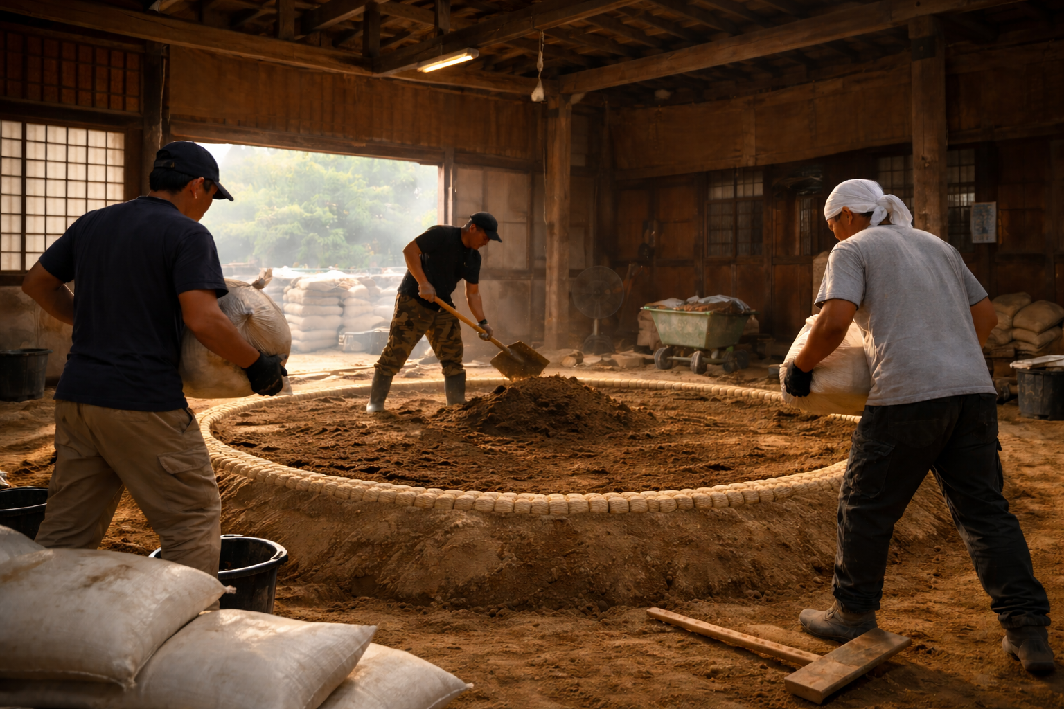 土を入れ終えると、力士たちが総出で踏み固める作業が始まります。体重をかけて何度も踏み込み、均一な硬さになるよう調整していく重労働です。ここで力を発揮したのが、土俵づくりの専門家の存在でした。通常であれば数日かかる工程ですが、今回は時間の制約があるため、1日で仕上げるという厳しい条件のもとで作業が進められました。