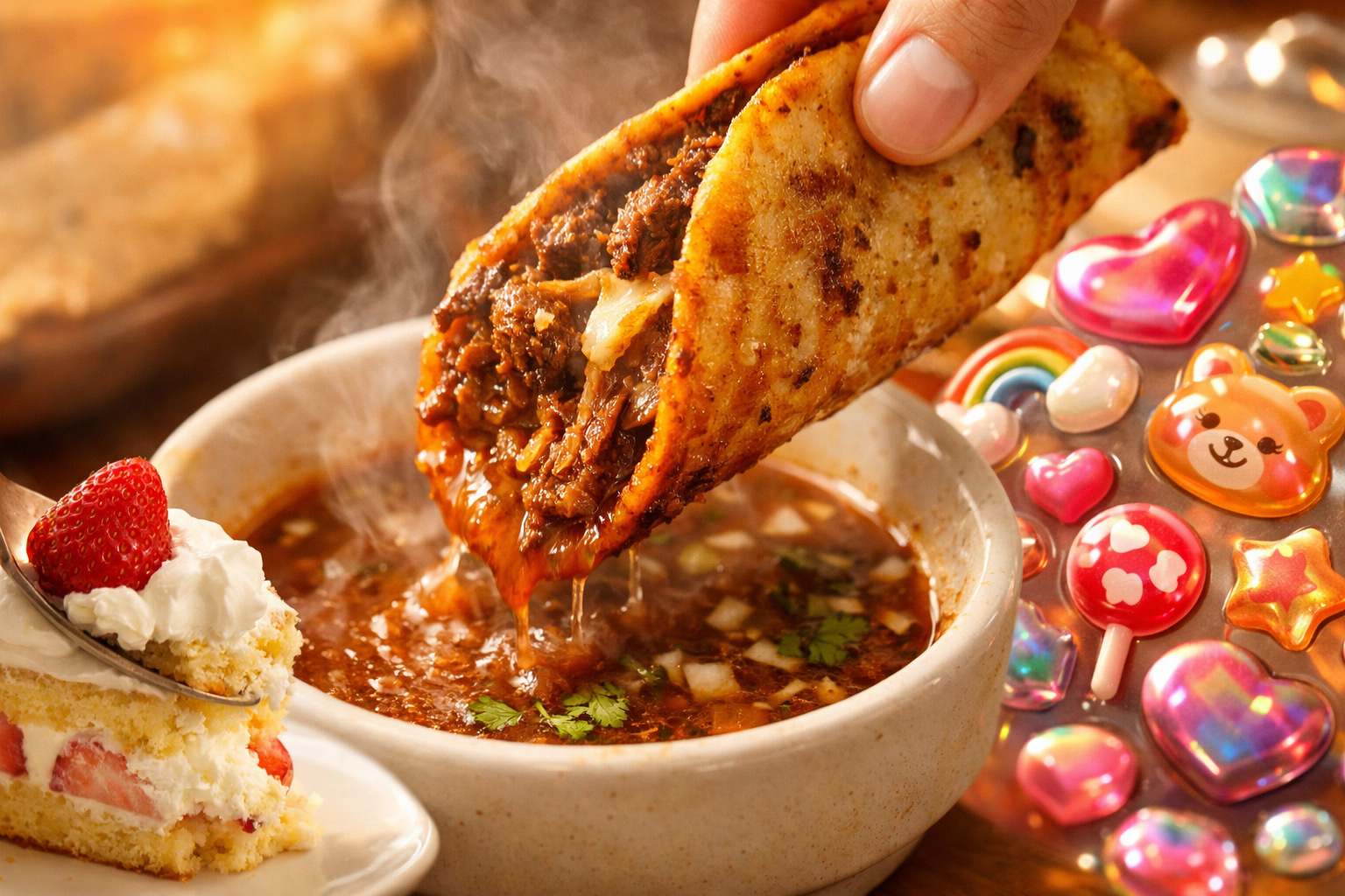 最近よく耳にする 飲めるタコス という言葉は、「噛む料理」であるはずのタコスが、スープに浸すことで“飲める感覚”に変わる新しい食体験を指します。見た目はボリューム満点なのに、口に運ぶと驚くほどスッと入ってくる。そのギャップこそが、このグルメの最大の魅力です。
