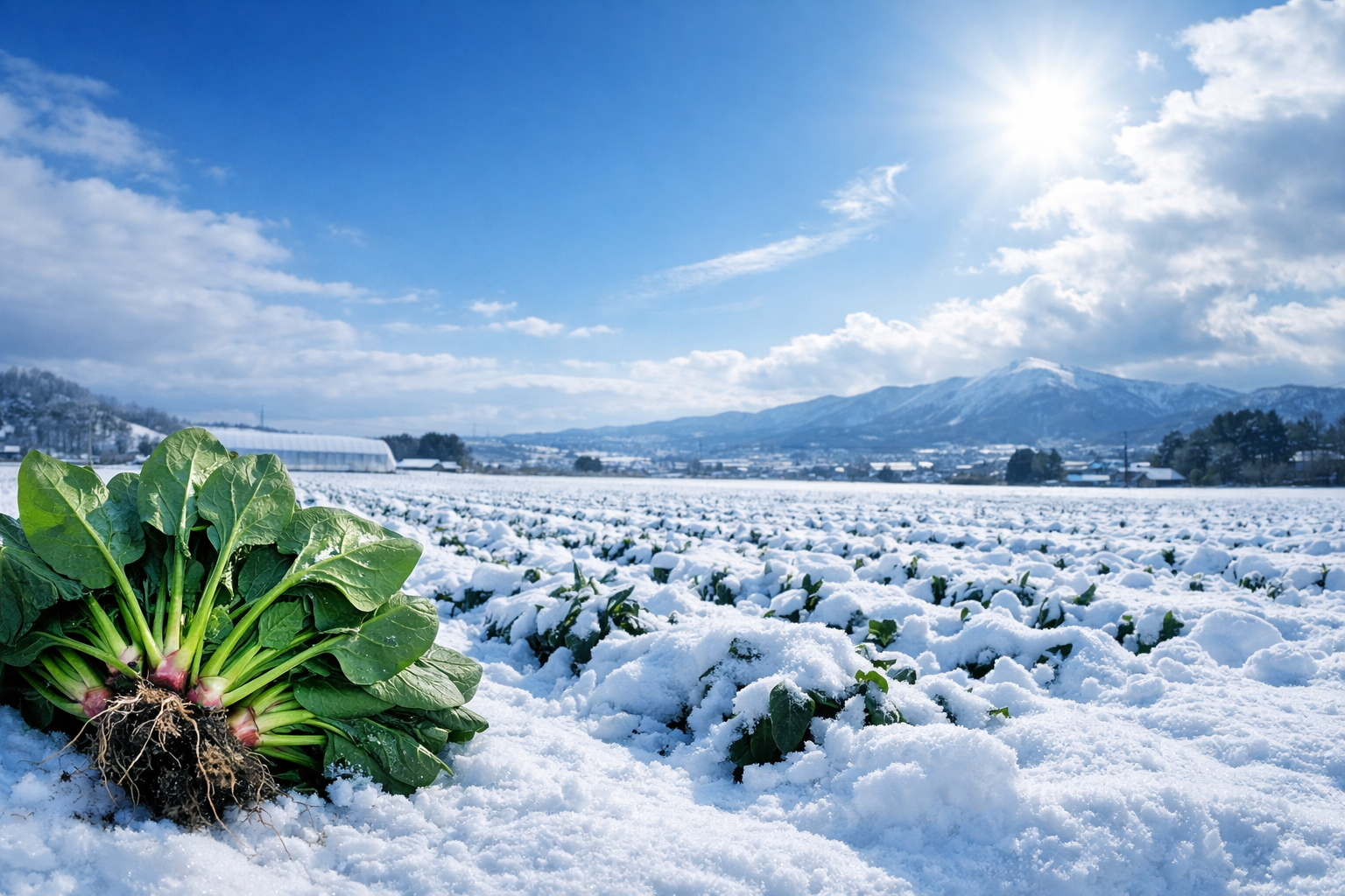 舞台になるのは福島県郡山市。冬になると雪まじりの風が吹き、畑は一面の寒さに包まれます。その環境を味方にして育つのが『レジェンドほうれん草』。元美容師の名人が10年かけて辿りついたこだわりの栽培方法で、通常よりもゆっくり成長することが特徴です。