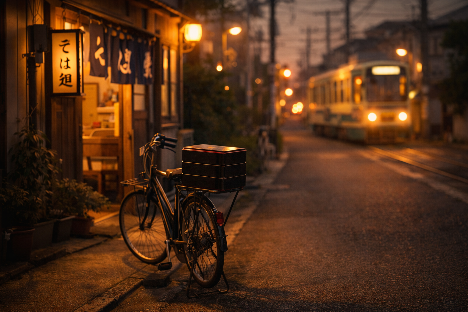 その後、明治・大正、そして昭和と時代が進む中で、自転車で器を高く積み上げて走る「出前持ち」の姿が日本の都市風景の一部になりました。