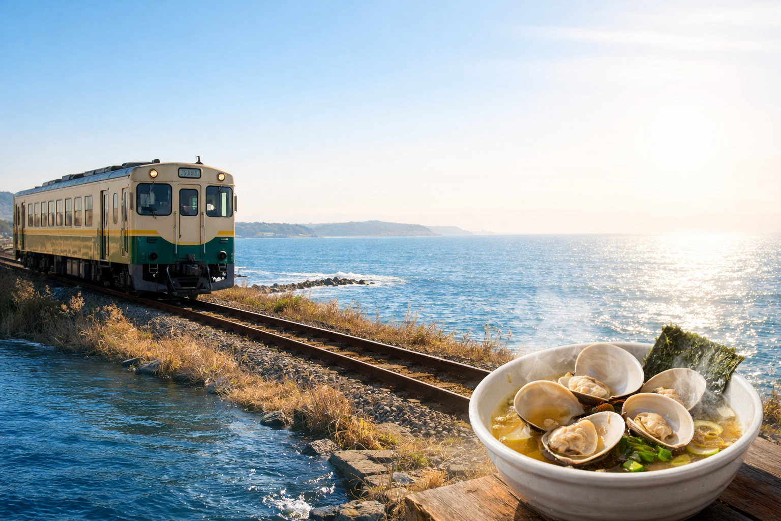 ひときわ目を引いたのが、大洗町にある朝日堂 本店のご当地ラーメン、「はまぐりラーメン」。湯気立つ丼には、茹でたもずく入りの麺と、大洗産の大粒はまぐりがどんとトッピング。貝から出る濃厚な出汁に、磯の香りの利いたスープが合わさり、仕上げにたっぷりとのる海苔が香りをプラスします。那珂湊周辺は昔からはまぐりの名産地としても有名で、冬から春にかけて旬を迎えます。