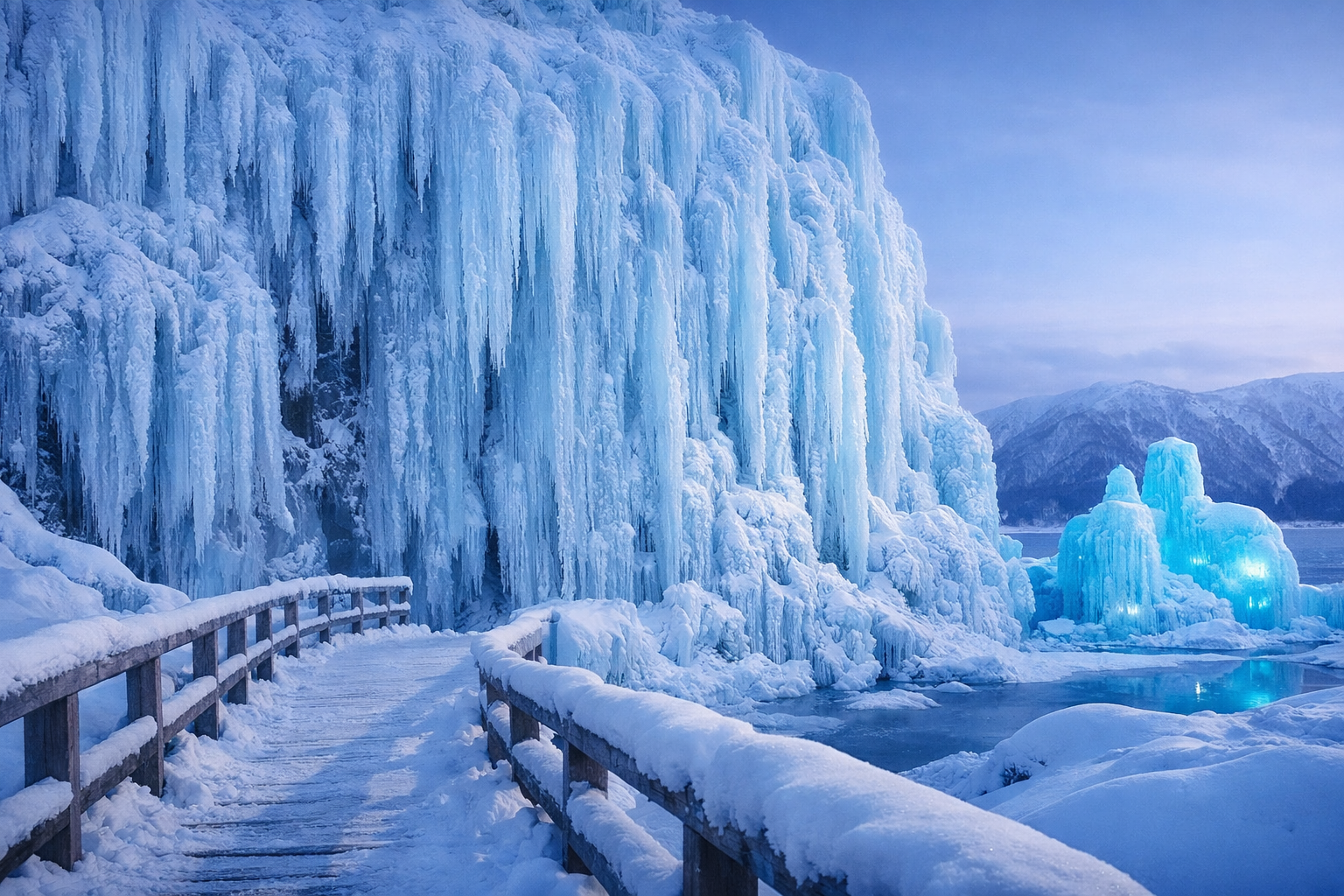 支笏湖ブルーが輝く千歳・支笏湖氷濤まつりの幻想世界と冬遊び