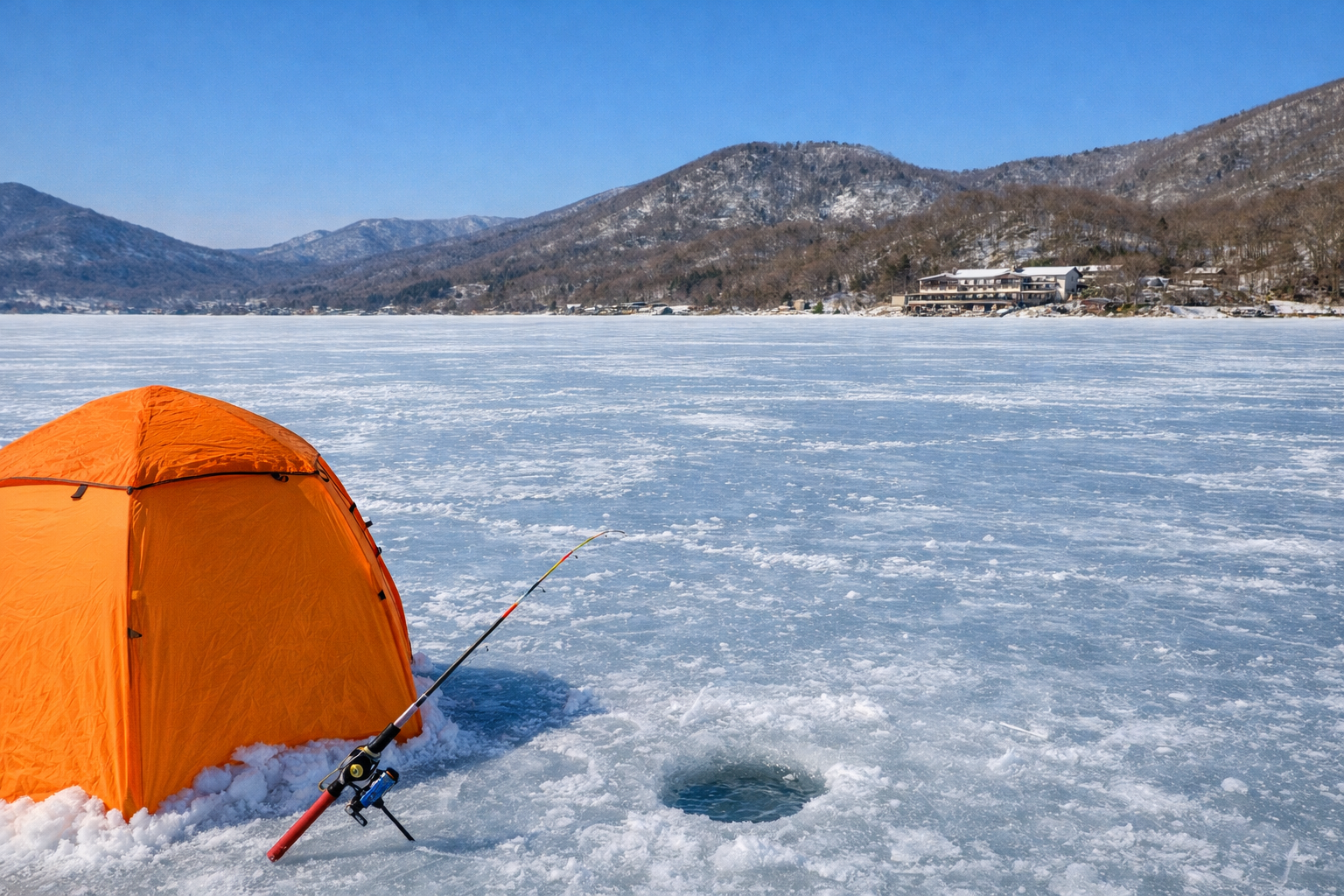 舞台になるのは、赤城山の山上にある湖、赤城大沼(大沼)です。冬になると湖が凍り、湖の上に立って穴を開ける「氷上ワカサギ釣り」ができる場所として知られています。